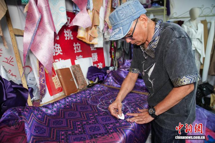 图为扬江诚正在1块壮锦布料上绘版。中新社记者 旧冠行 摄